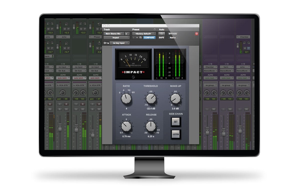 Impact includes four selectable compression ratios and variable controls for Attack, Release, Threshold, and Make-up Gain. The interface features a Gain Reduction meter that replicates an analog meter with an animated bouncing needle, displaying authentic ballistics as it meters gain reduction. Impact also includes a side-chain input, enabling you to use any Pro Tools audio track as an external key.
