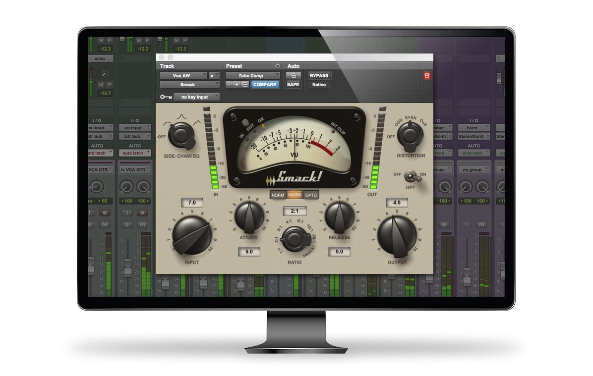 Featuring three compression modes, unique compression ratios, and harmonic distortion, Smack! will help you bring a wide range of sonic variation to your mix. The plugin supports sidechain processing, multichannel track types, and the full range of Pro Tools sample rates and plugin formats. Automatic gain reduction controls the volume of just about any source - in a very musical manner - adding fullness, intelligibility, and excitement to any track. Plus, an intuitive interface with the look and feel of vintage devices enables you to create a huge range of tonal coloration with a minimal set of controls.