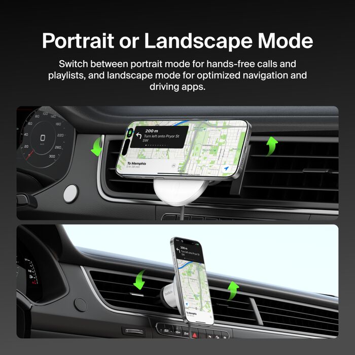 This MagSafe-compatible wireless car charger delivers up to 2x faster wireless charging with Qi2 to charge your Qi2-compatible iPhone (series 12 and up) quickly, easily, and securely up to 15W. The vent mount stays stable while driving, and convenient, seamless one-handed alignment allows for portrait and landscape.