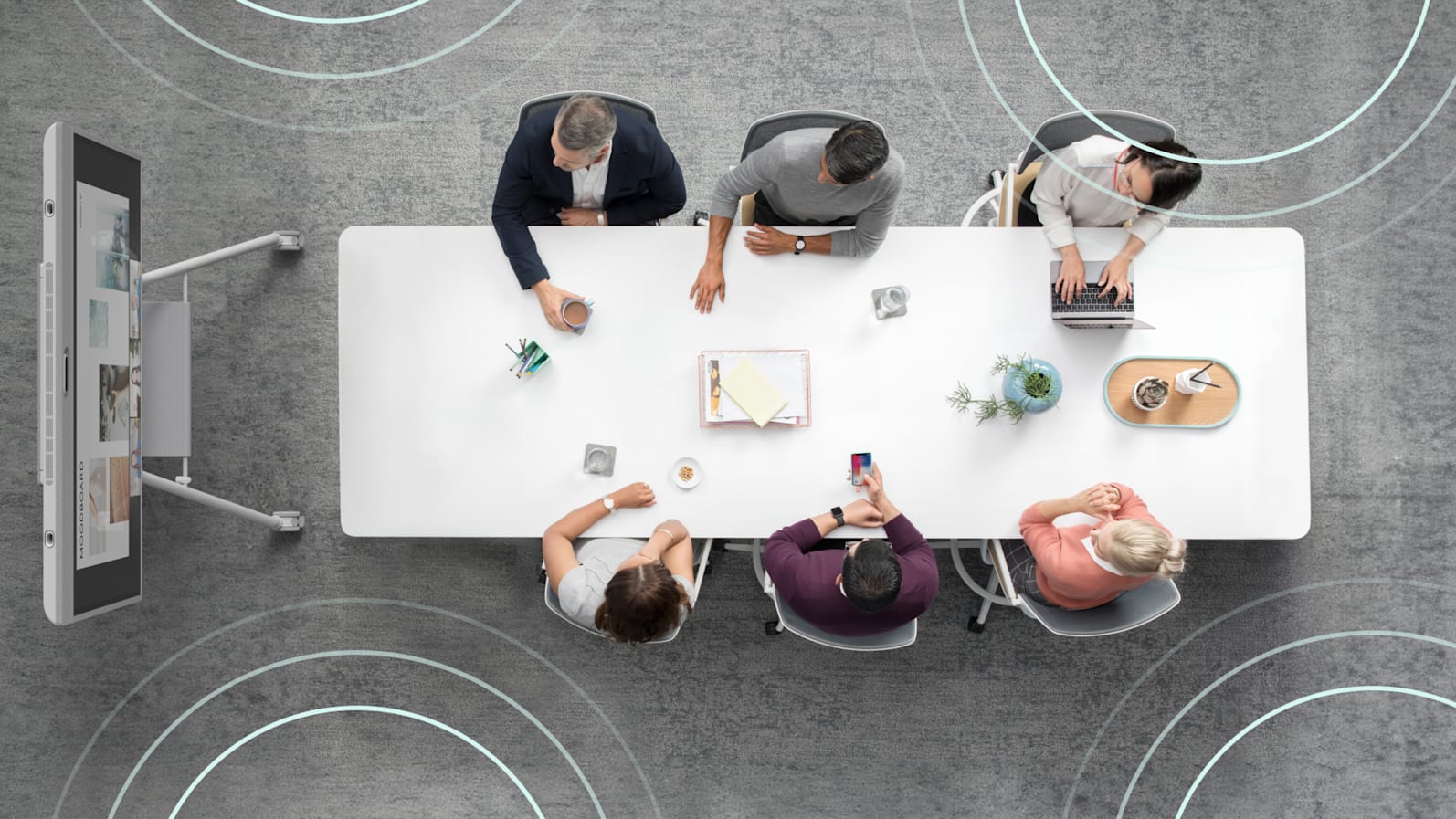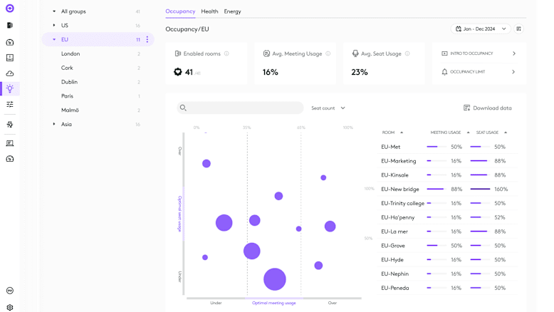 • Room Health: Enhance workplace wellbeing with actionable insights on air quality. Delve more closely into environmental data like temperature, CO2 levels, particulate matter, and volatile organic compounds (VOC) and get suggestions on possible ways to improve.